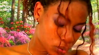 Three horny dark-hued lesbians fucking with strapon