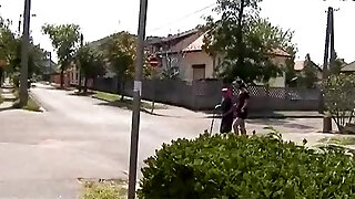 Attractive babe Candy Sweet and a lesbian grannie fuck outdoors