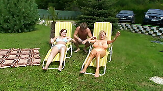 гонзо секс втроем с 2 горячими красавицами на открытом воздухе у бассейна