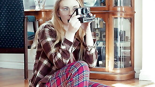 белокурая нимфа вдыхает искусственный пенис и получает удовольствие после драки